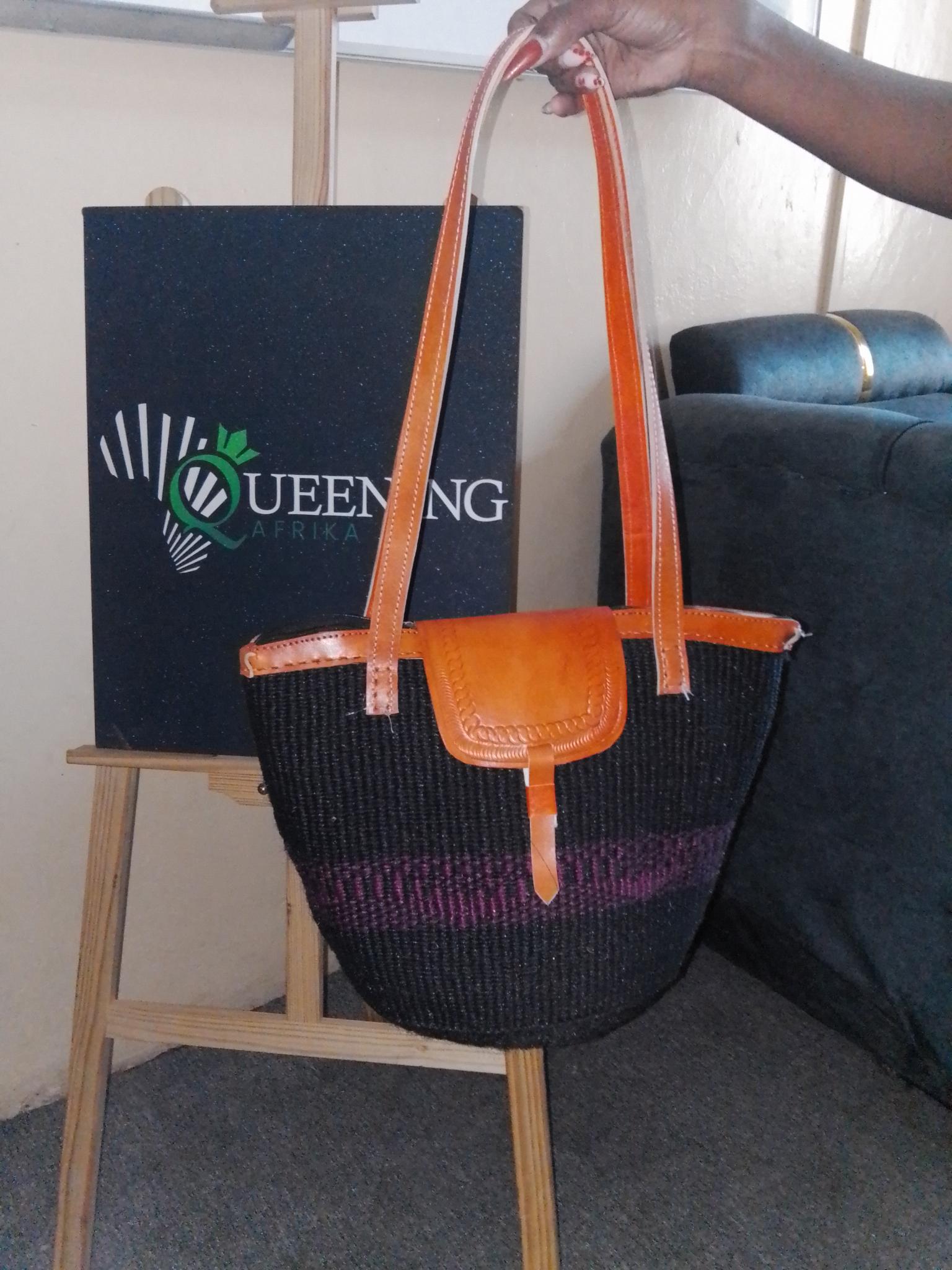 This Queening Afrika artisanal tote is a stunning blend of traditional African craftsmanship and contemporary utility. Hand-woven with intricate detail, this bag features a rich, textured black body accented by a deep violet stripe, making it a versatile statement piece for any occasion.